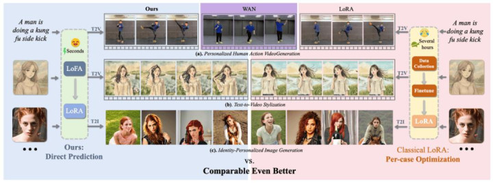 为弥补这一空缺,本论文淡漠了 LoFA—— 一种通用的学习框架,不详从种种化或细粒度的用户指示中径直预测个性化 LoRA 参数,齐全视觉生成模子的快速适配(见图 1 “LoFA” 部分)。